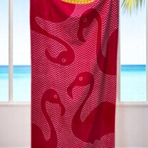 Unesite tropski šarm na plažu uz peškir Flamingo Tropic dimenzija 164×85 cm. Ovaj upečatljiv peškir u živim nijansama roze i crvene krasi prepoznatljiv motiv flamingosa na cik-cak pozadini, savršen za letnje dane uz more ili bazen. Rubovi su ukrašeni šarenom bordurom sa kružićima u kontrastnim bojama, dajući mu razigran izgled.