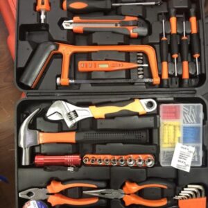 Set alata uključuje: Čekić, klešta, set inbus ključeva, izolir traka, francuski ključ, set šrafova i tiplova, šrafcigeri, skalpel, metar, testera (bonsek)…
