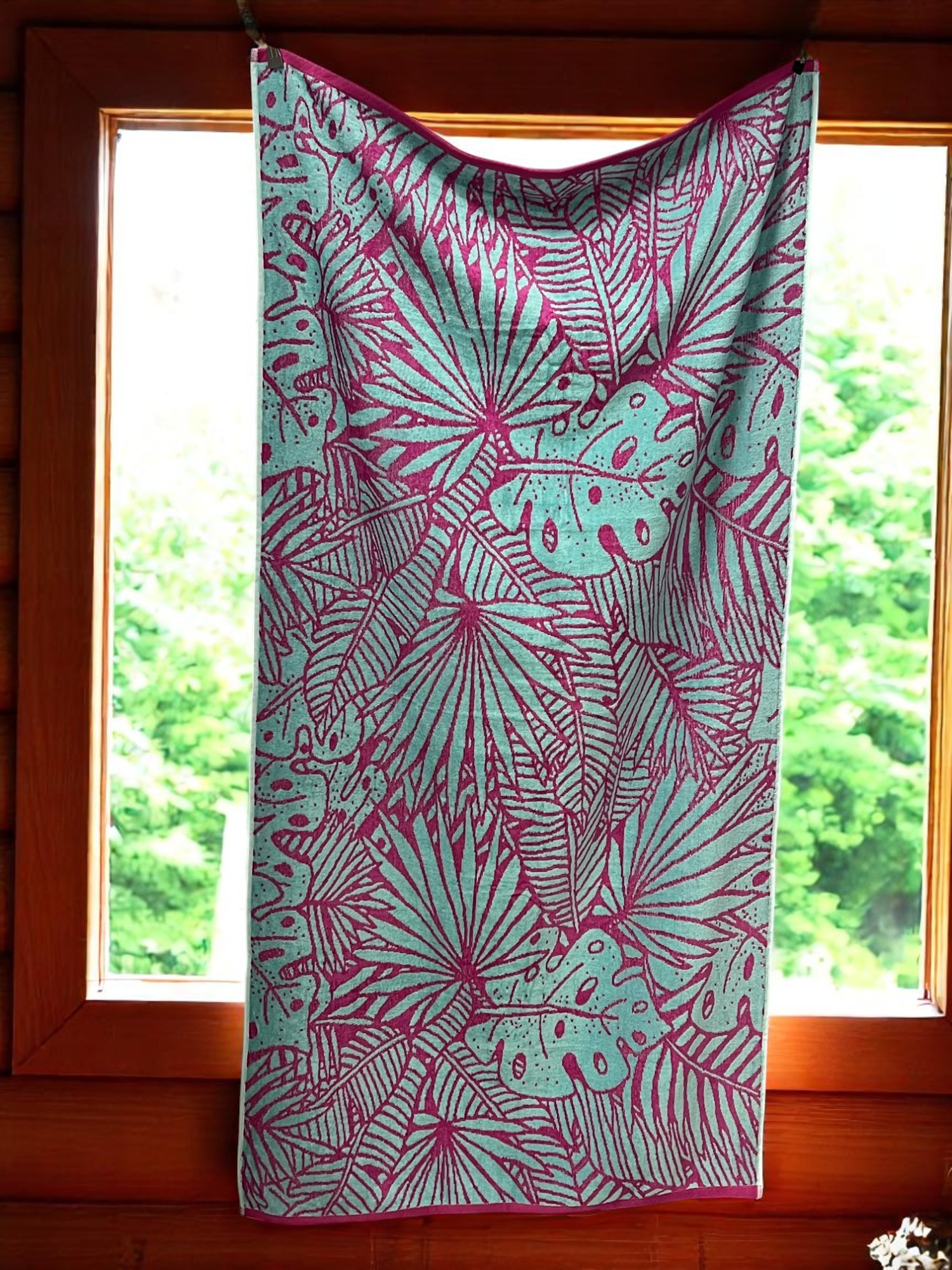 Unesite osveženje na plažu sa ovim šarmantnim peškirom u nežno roze boji, ukrašenim motivima tropskog cveća. Dimenzije 83×160 cm pružaju dovoljno prostora za udobno ležanje i sušenje nakon kupanja.