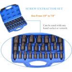 - Paket uključuje: 13kom odstranjivač udarnih vijaka i matica: 1/4″(6,35mm), 5/16″(8mm), 3/8″(9,5mm), 10mm, 7/16″(11mm), 12mm, 1/ 2”(12,7mm), 13mm, 9/16”(14mm), 5/8”(16mm), 17mm, 11/16”(17,5mm), 3/4”(19mm); 5PCS Screw Extractor: #1, #2, #3, #4, #5; 5kom desna HSS burgija: 9/32″, 1/4″, 5/32″, 1/8″, 3/32″; 2kom za razbijanje oraha: #2, #3; 1PC 3/8″ pogon.